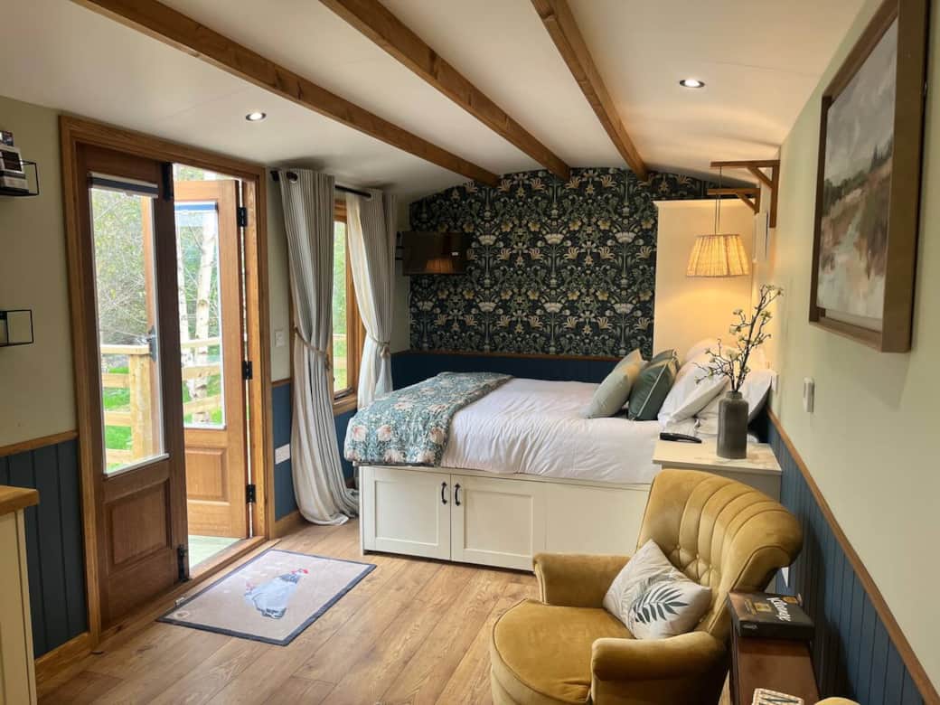 Our luxurious shepherds hut is the perfect cosy stay for two people. It features a kingsize bed, kitchenette (with stove, fridge/freezer, microwave, kettle & toaster), ensuite bathroom with walk in shower and a small lounge/dining area. The hut is equipped with underfloor heating, television, wifi and compliant with health & safety regulations.